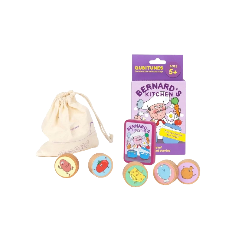 “Bernard's Kitchen Game” gioco extra per la Console interattiva Qubitunes di Qubs. Consente ai bambini di esplorare il mondo della cucina attraverso suoni realistici e storie coinvolgenti, stimolando la creatività e l’immaginazione senza l’uso di schermi.