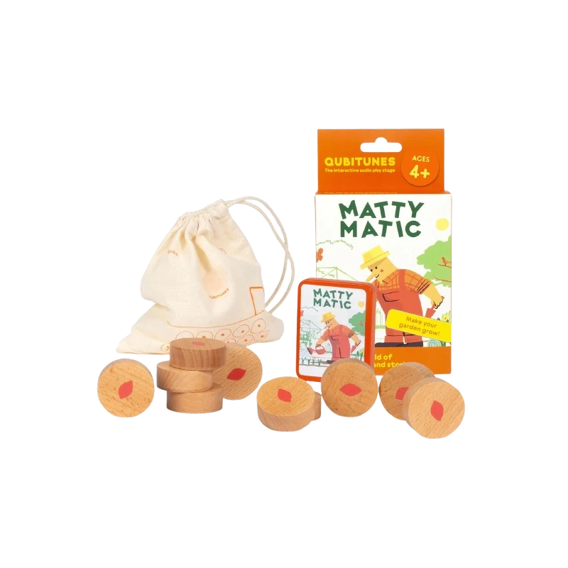 Questo gioco include una cartuccia in legno e 4 blocchi raffiguranti personaggi matematici. Posizionandoli sulla Console interattiva di Qubitunes, i bambini possono ascoltare e combinare suoni che rappresentano operazioni matematiche, creando storie e sfide numeriche uniche. “Matty Matic” offre un'esperienza educativa che promuove l'apprendimento attraverso il gioco sensoriale.