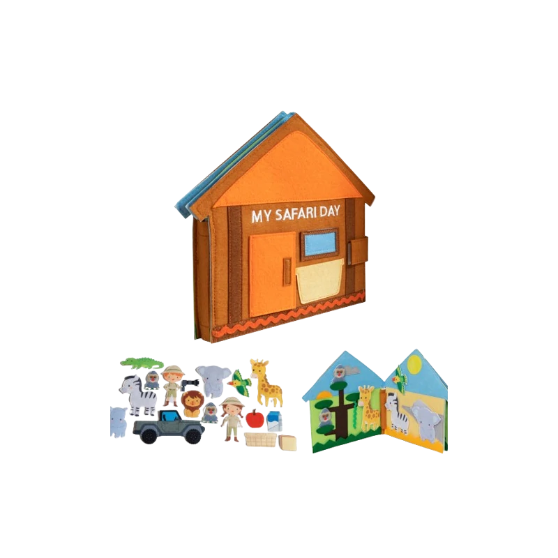 Realizzato in feltro di alta qualità e progettato in Italia, questo libro presenta 6 pagine dedicate a scene del Safari con animali ricche di dettagli interattivi. Ogni pagina invita il bambino a esplorare e interagire con elementi da toccare, spostare e osservare: questo stimola la curiosità verso forme, colori e storie da inventare. I materiali sono testati in conformità alle normative europee sulla sicurezza dei giocattoli.