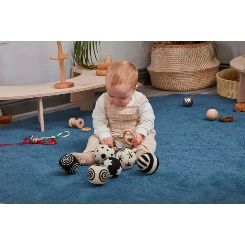 Queste palline in feltro Cosy rappresentano uno strumento educativo versatile per attività di gioco libero, esplorazione tattile e sviluppo delle competenze visive nei primi mesi di vita. I contrasti in bianco e nero aiutano i neonati a sviluppare la discriminazione visiva e la capacità di seguire oggetti in movimento, mentre la texture morbida del feltro invita il bambino a toccare, afferrare e muovere le palline con le proprie mani. Ideali sia per il gioco individuale sia per momenti di condivisione con educatori o genitori, sono perfette in contesti come nursery e ambienti di apprendimento precoce