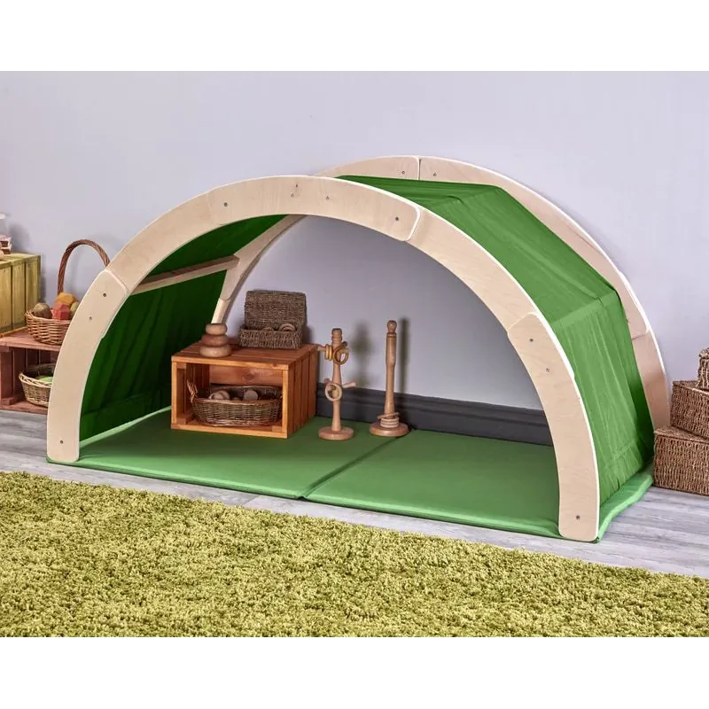Questo arco in legno è perfetto per trasformare un angolo di aula o stanza in uno spazio dedicato alla lettura, al gioco simbolico o a momenti di tranquillità. Grazie alle sue dimensioni compatte, può essere facilmente inserito in nidi, scuole dell’infanzia o zone relax in casa, offrendo un rifugio accogliente dove i bambini possono accoccolarsi con un libro, conversare o praticare attività sensoriali. La struttura può essere personalizzata con stoffe, coperte o tessuti per creare atmosfere diverse, incoraggiando così la creatività e il senso di appartenenza allo spazio.